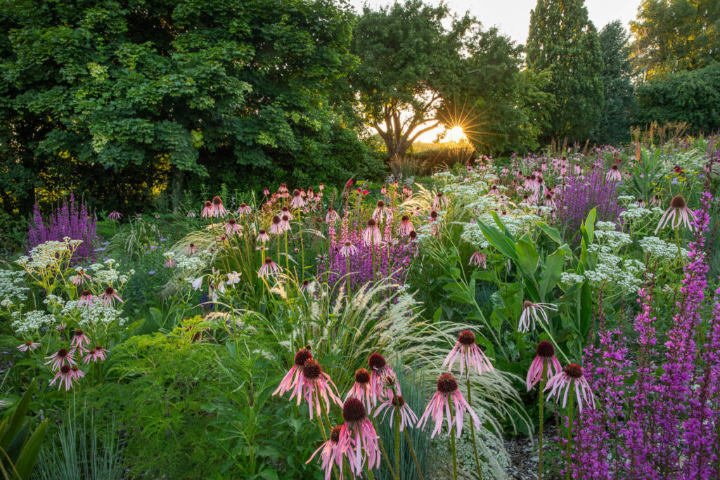 Spécialiste de la photographie de plantes et de jardins, le génial photographe britannique Marianne Maréjus vous surprend encore avec une belle photo prise juste avant le coucher du soleil dans un jardin privé conçu par James Hitchmough. Sur l'image, vous pouvez voir la lumière du soleil filtrer à travers la prairie de plantes vivaces, et qui à ce moment illuminait un parterre de fleurs de Échinacée pallida.