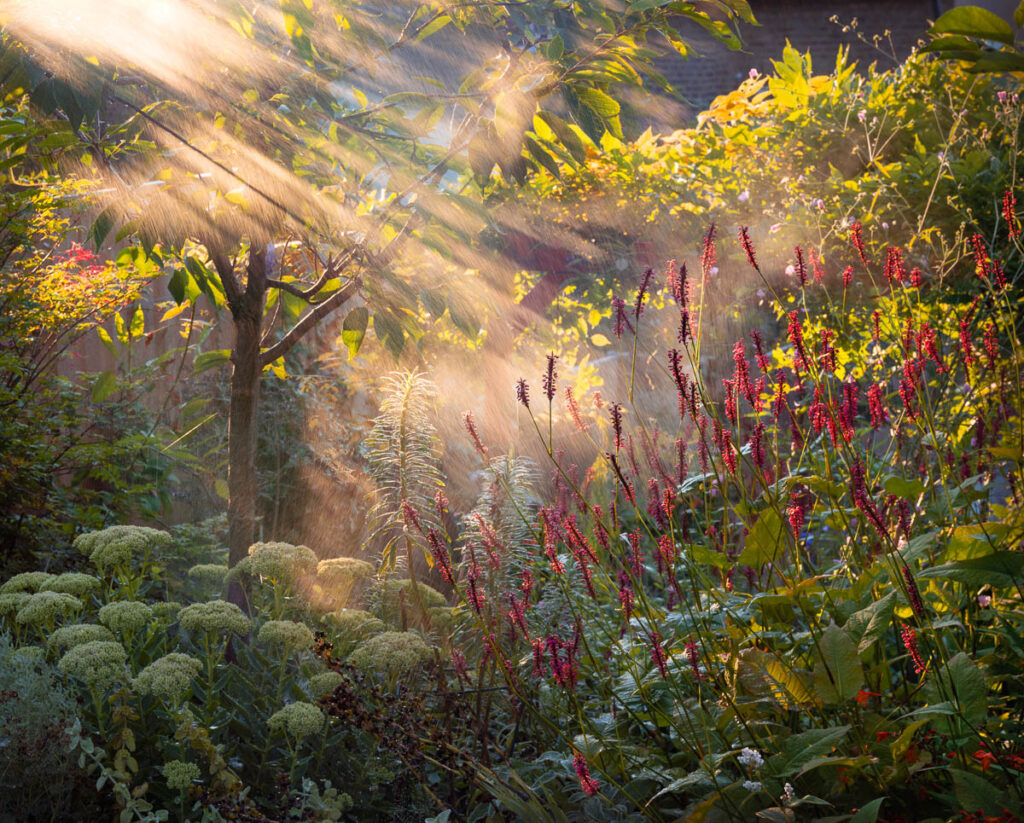 Face à la sécheresse dans le sud du Royaume-Uni, il a recréé sur la deuxième photographie l'atmosphère de pluie dans un jardin du sud de Londres avec un pulvérisateur artisanal, transformant la lumière du soir en une oasis éphémère.